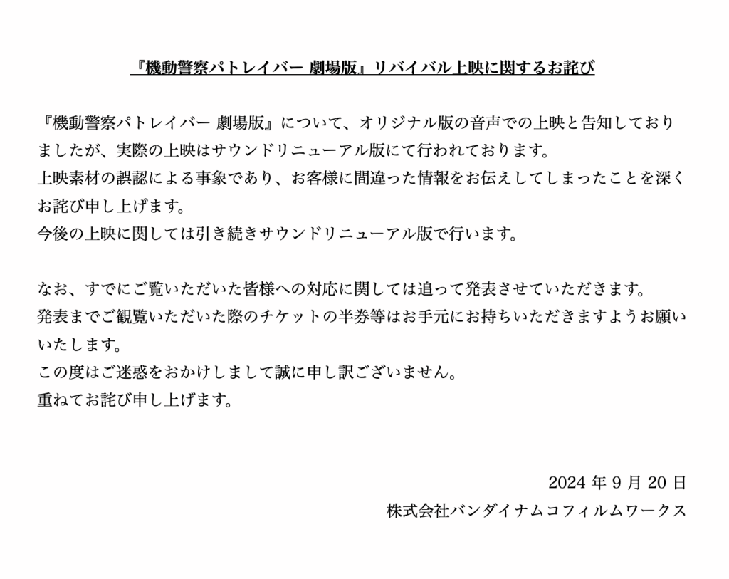 『機動警察パトレイバー 劇場版』リバイバル上映に関するお詫び